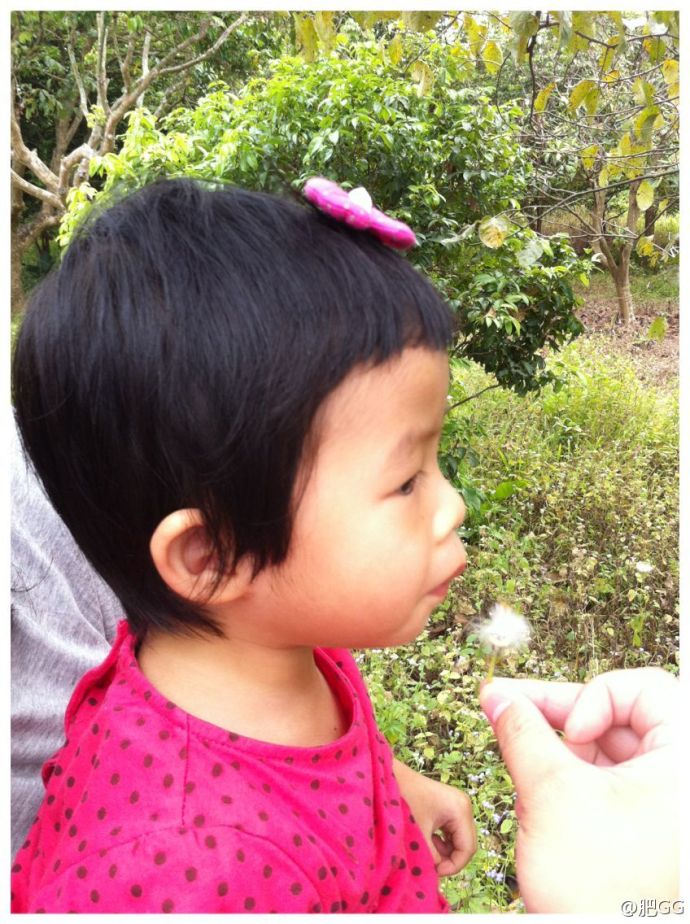 今天带#薯饼MM# 去增城玩,在莲塘绿道,小妹妹吹到一朵好大的蒲公英了!