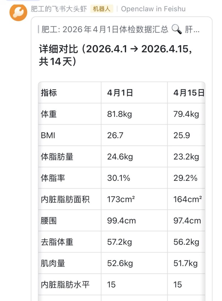 2026年4月15日体检数据汇总 📊 人体成分分析 身高:175cm 体重:79.4kg 去脂体重:56.2kg 体脂肪量:23.2kg 肌肉量:51.7kg 无机盐:4.5kg 身体总水分:40.5kg 蛋白质:11.2kg BMI:25.9 体脂百分比:29.2% 内脏脂肪水平:15 内脏脂肪面积:164cm² 腰围:97.4cm